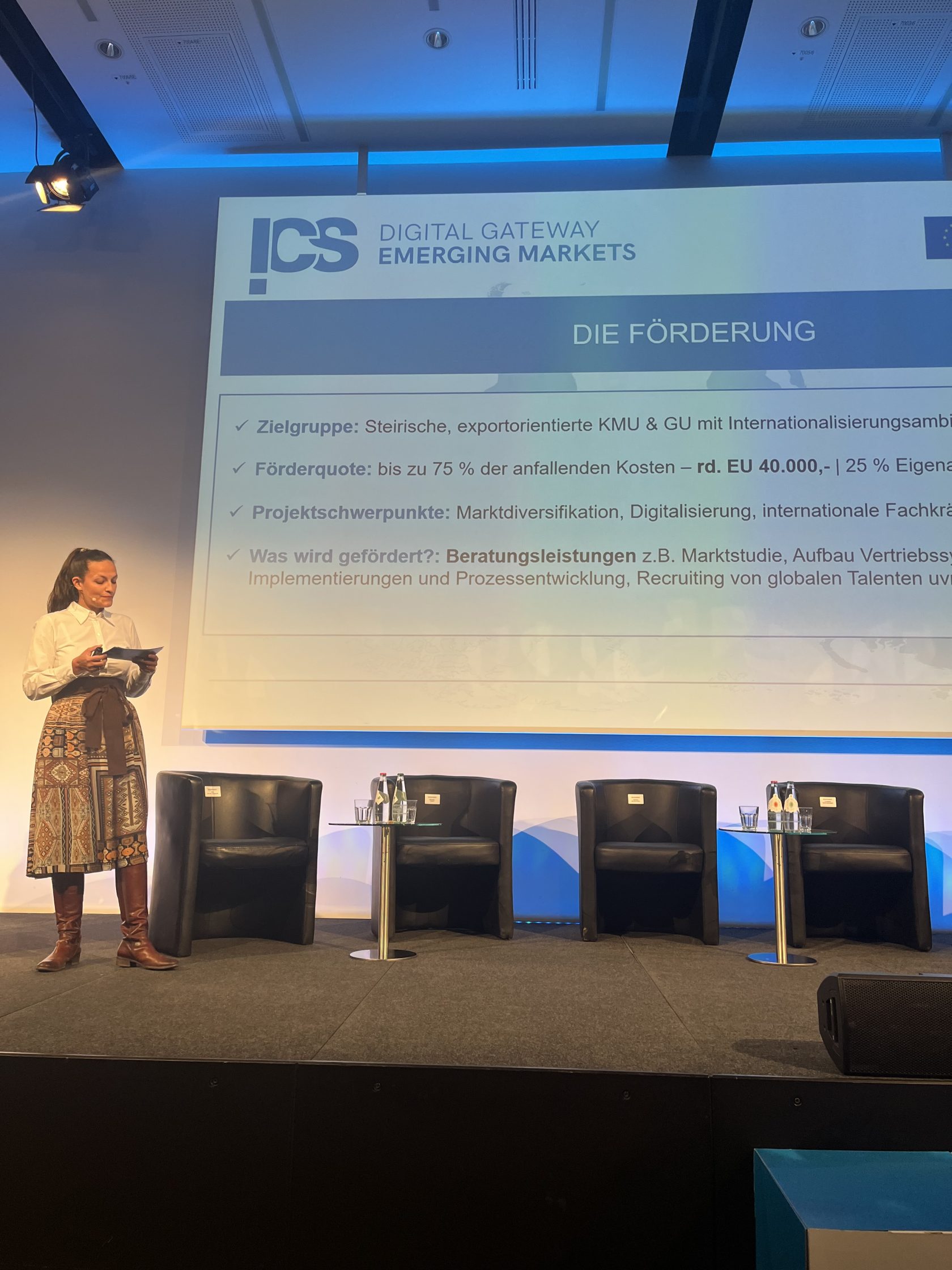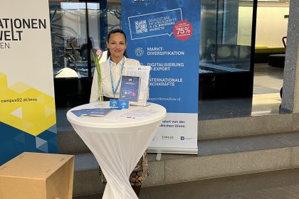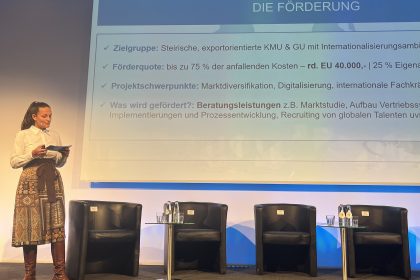 Lisa-Maria Katholnig, Projektleiterin DiGEM, stellte am Summit die neue Förderung vor, mit der wir steirische, exportorientierte Unternehmen bei Markteintritt & -ausbau sowie bei Digitalisierungs- & Fachkräftemaßnahmen in dynamischen Wachstumsmärkten rund um den Globus unterstützen.
