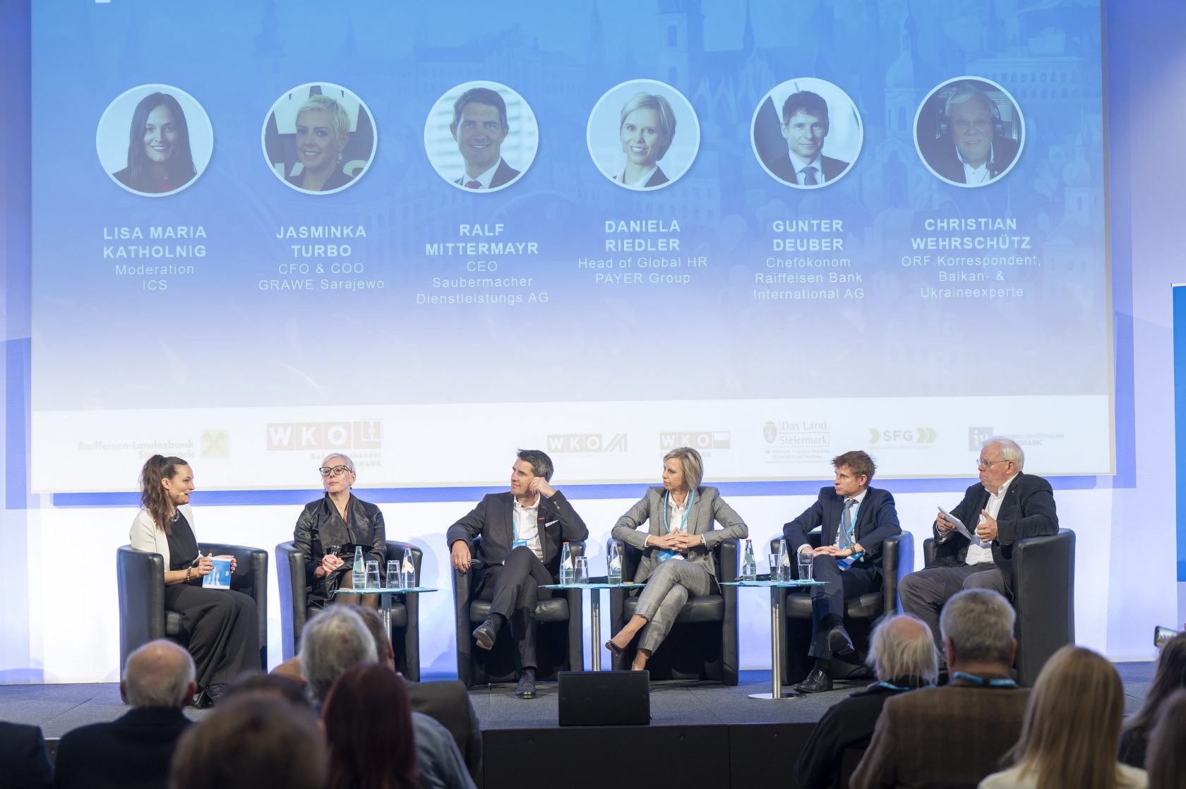 Rund 170 Teilnehmer:innen lauschten gebannt den Ausführungen von ORF-Korrespondent Christian Wehrschütz, der seine Keynote aus geopolitischer Sicht, mit spannenden Anekdoten aus seinem jahrzehntelangen Einsatz in der Region schmückte. RBI Chefökonom Gunter Deuber analysierte die wirtschaftliche Dynamik des Westbalkans, ist er mit einem Anteil von 4,4% für österreichische Unternehmen ein durchaus relevanter Exportmarkt. Beim anschließenden Talk fasste Saubermacher-CEO Ralf Mittermayr den Game-Changer im Westbalkan für das Unternehmen so zusammen: „Wir mussten unser Denken >West beglückt Ost< aufgeben.“