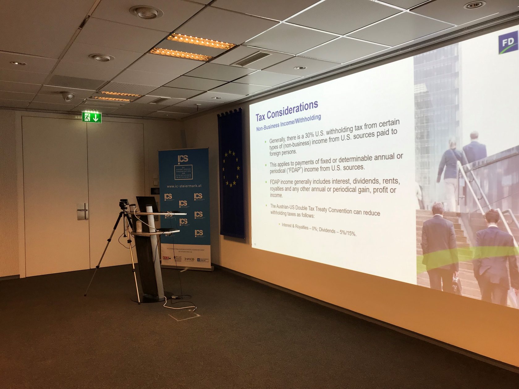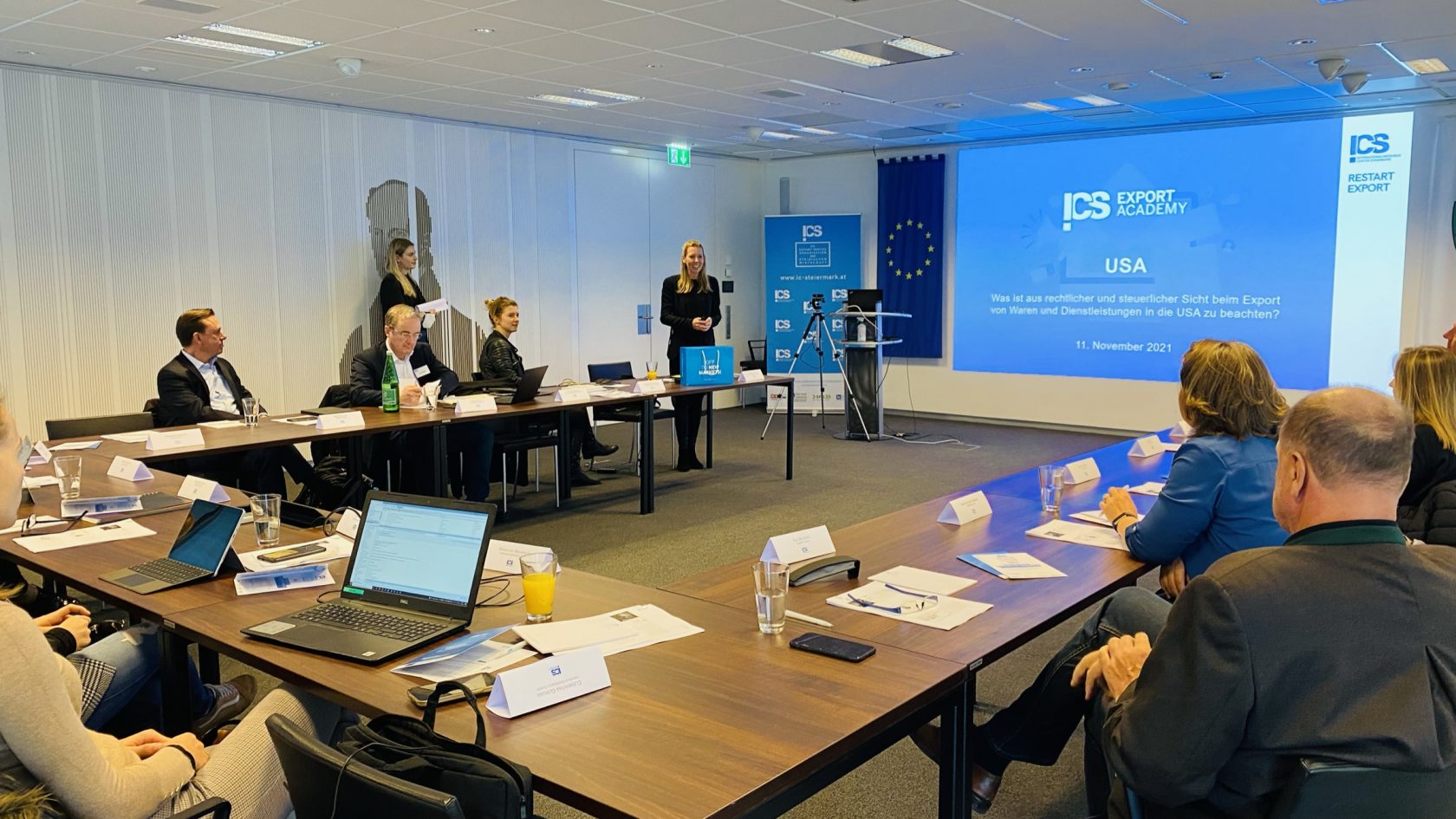 Das ICS hat am vergangen Donnerstag eine Export Academy zu Steuer- und Rechtsthemen, die beim Waren- und Dienstleistungsexport zu beachten sind, angeboten. 13 steirische Unternehmen, die ihr Engagement in den USA ausbauen möchten, erhielten wertvolle Tipps, Dos &Dont’s vom US-Anwalt Tycho Stahl, dem US-Steuerberater Mike Whitacer und der Aussenwirtschaft Austria-Expertin Angelika Heitzmann.