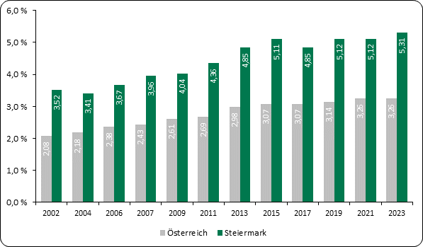 Abbildung 1: F&E-Quoten insgesamt in Österreich und der Steiermark im Zeitraum 2002 bis 2023 in Prozent des Brutto-Regionalproduktes (BRP)