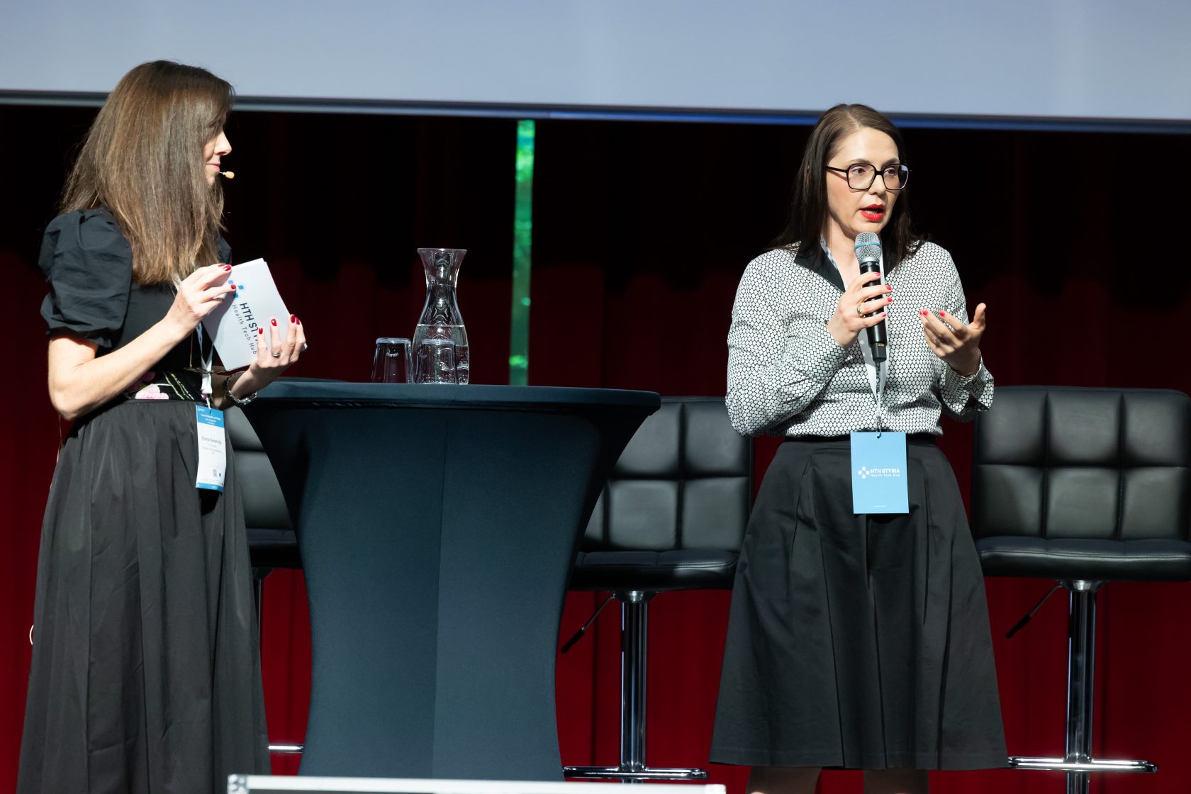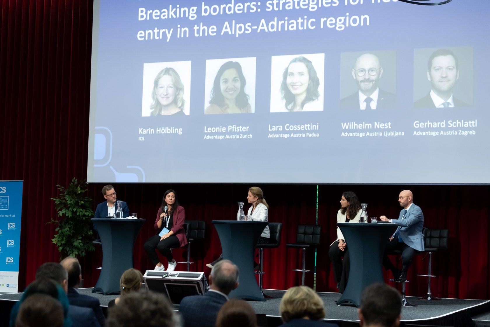 Karin Hölbling vom Internationalisierungscenter Steiermark moderierte die Session „BREAKING BORDERS: Strategies for Health Market Entry in the Alps Adriatic Region“ mit Gästen aus Slowenien, Kroatien, Italien und der Schweiz. Diskutiert wurden grenzüberschreitende Strategien für den Markteintritt im Gesundheitssektor. Auf der Bühne nahmen Expert:innen der Aussenwirtschaft Austria Platz: