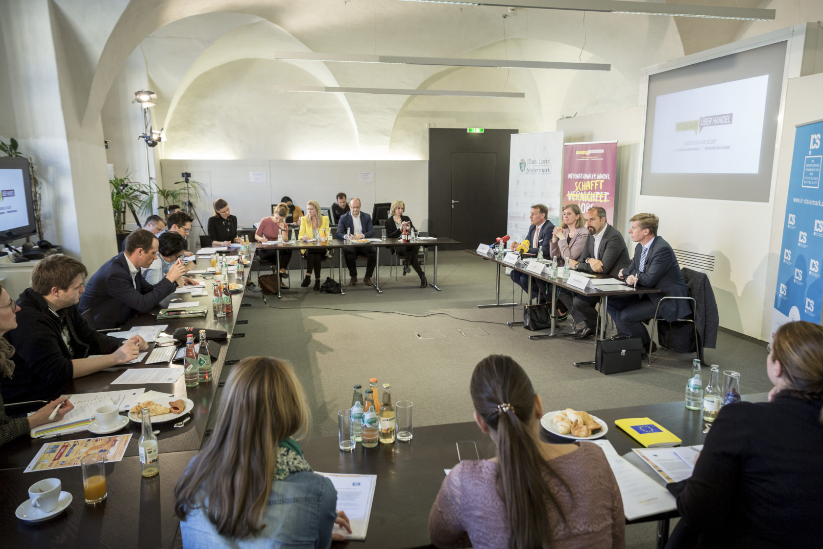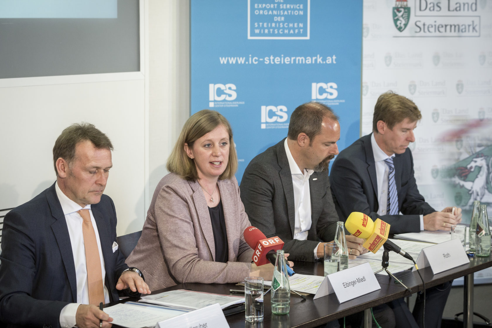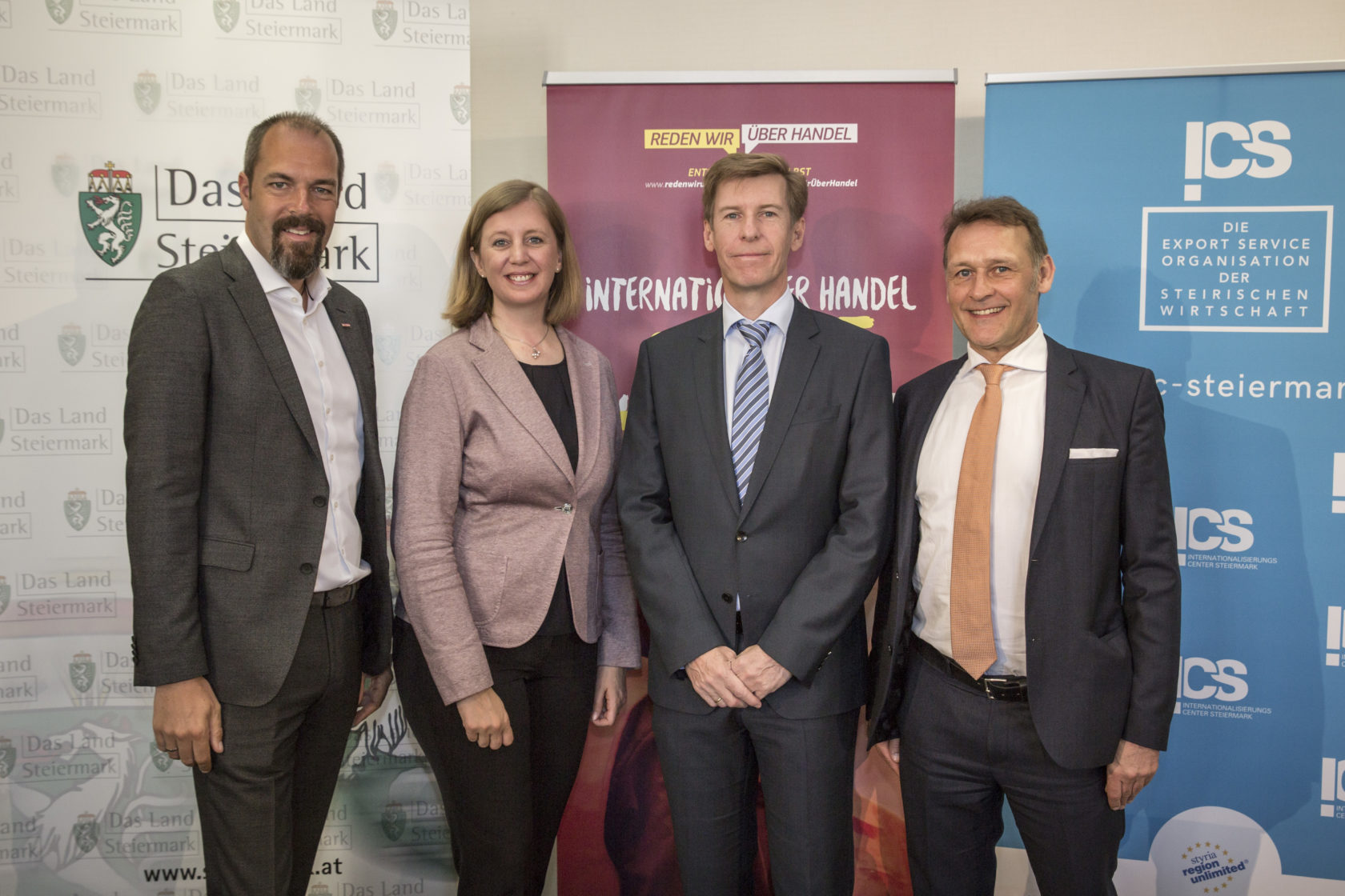 Die Gesprächspartner bei der Pressekonferenz waren Dr. Johann Sollgruber (Berater in Handelsfragen, Vertretung der Europäischen Kommission in Österreich), MMag.a Barbara Eibinger-Miedl (Wirtschaftslandesrätin), Mag. Jürgen Roth (Vizepräsident der Wirtschaftskammer Österreich und Aufsichtsratsvorsitzender der Internationalisierungscenter Steiermark GmbH) und Mag. Andreas Kindermann (CEO Wollsdorf Leather).