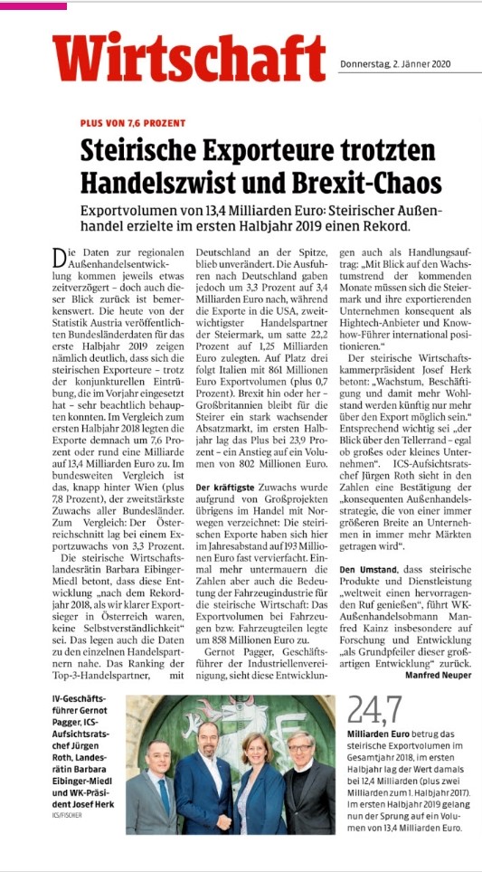 „Die steirische Exportwirtschaft hat ihrer Erfolgsgeschichte ein weiteres Kapitel hinzugefügt. Nach dem Rekordjahr 2018, als wir klarer Exportsieger in Österreich waren, sind die erneuten Zuwächse im ersten Halbjahr 2019 keine Selbstverständlichkeit. Diese Entwicklung ist besonders erfreulich, da jeder zweite Arbeitsplatz in der Steiermark durch den Export gesichert wird. Wir werden daher auch in Zukunft bestehende Kontakte zu wichtigen Handelspartnern weiter stärken und neue Märkte mit Wachstumschancen für heimische Betriebe bearbeiten.“