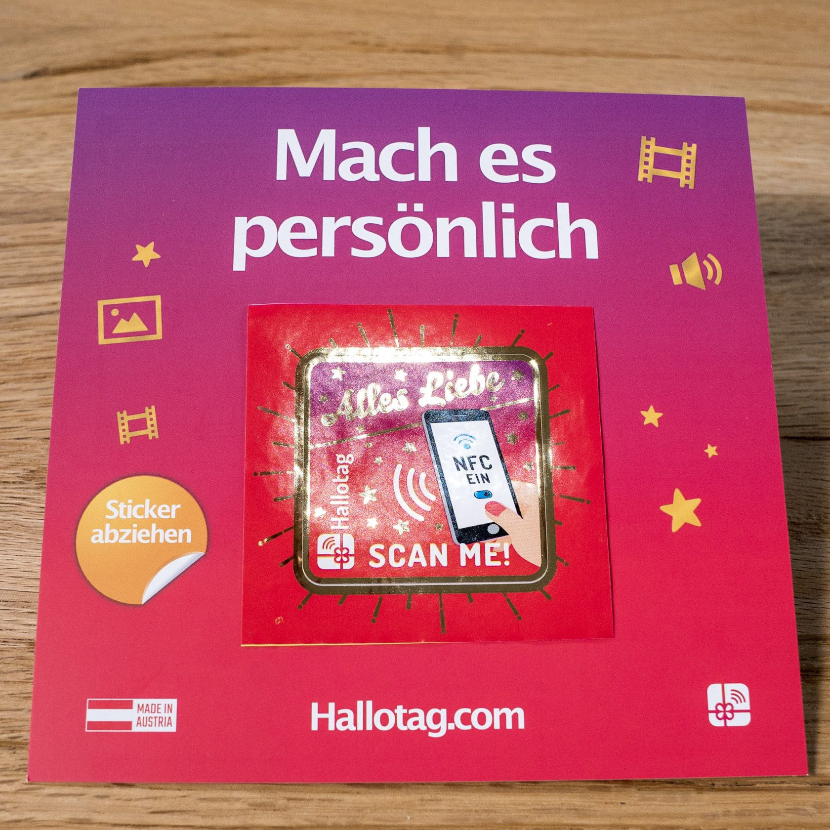 Hallotag ist eine Lösung bestehend aus einem NFC Hallotag Aufkleber, einer zugehörigen gratis Hallotag-App und eines Kundenbindungs- und Neukunden-Akquise-Programms. Mit Hilfe der App wird der Aufkleber mit berührenden Videos, Audios, Bildern und Texte ganz einfach kontaktlos bespielt.