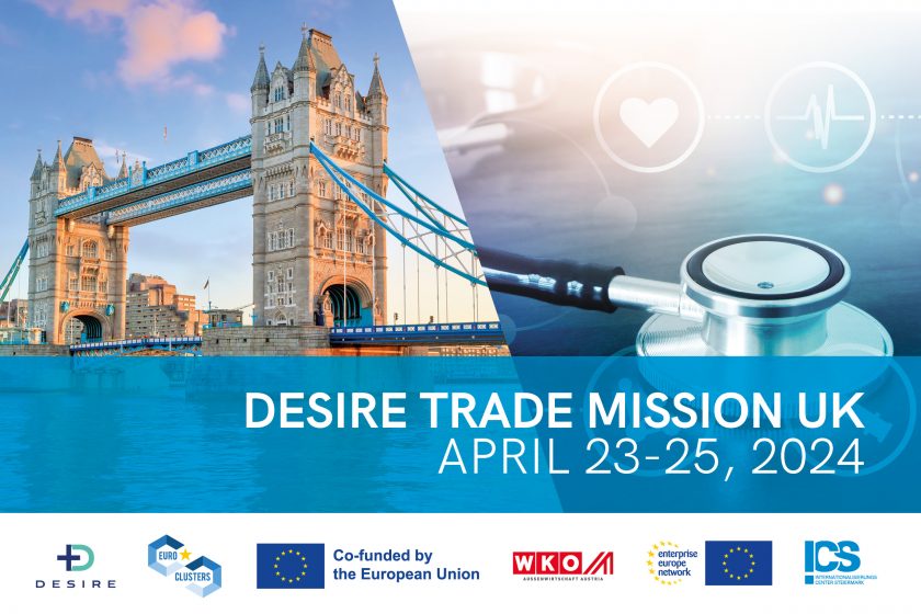 Our DESIRE trade mission will take us to London from April 23 to 25, 2024, together with our project partners Cluj IT, Human.technology Styria, EUROBIOMED and Interizon. Immerse yourself in the dynamic world of international e-health business and benefit from tailor-made B2B meetings, a networking reception, interesting company visits and a visit to the UK’s leading trade fair in the digital healthcare sector, the Digital Healthcare Show 2024. This exclusive initiative is meticulously crafted for professionals like you, engaged in the digital healthcare business and willing to explore international markets outside the EU!