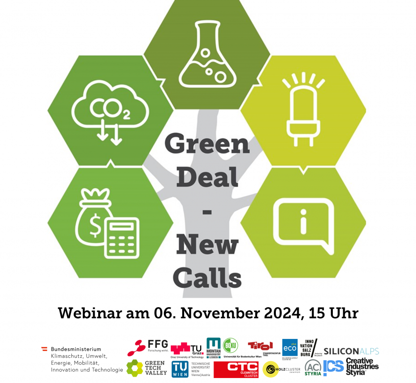 Das Bundesministerium für Klimaschutz, die FFG und der Green Tech Valley Cluster, in Kooperation mit dem ICS Internationalisierungscenter Steiermark, der Boku Wien, der Montanuniversität Leoben, TU Graz, der TU Wien, dem Cleantech Cluster OÖ, der Standortagentur Tirol, der Innovation Salzburg, der Creative Industries Styria, Ecoplus, dem ACstyria, SiliconAlps und dem steirischen Holzcluster, laden Sie sehr herzlich zum Webinar „Internationales Green Tech Förderungsupdate“ am Mittwoch, 06. November 2024 von 15:00 bis 16:30 Uhr ein.