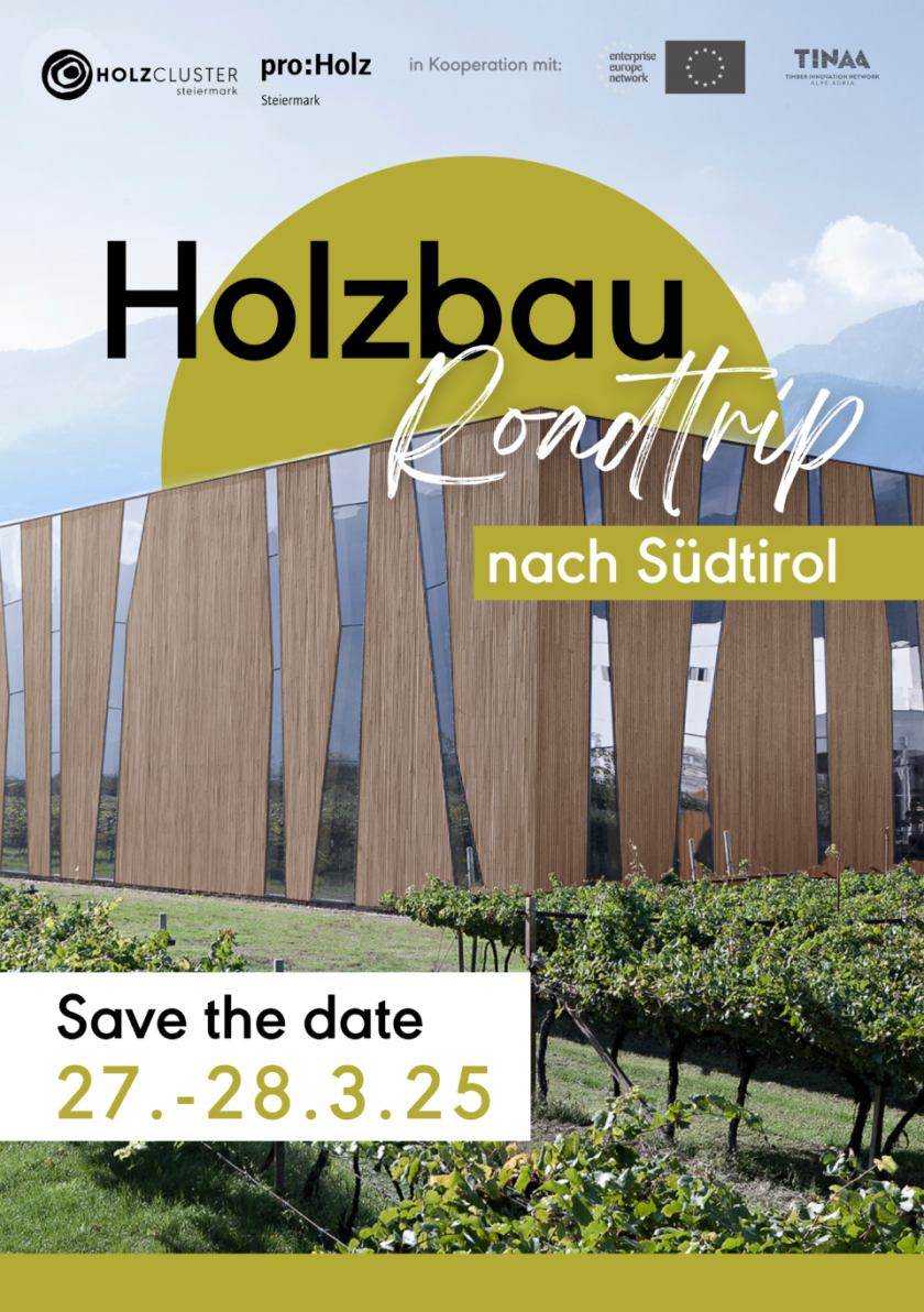 Der Holzcluster Steiermark und proHolz Steiermark in Kooperation mit dem Timber Innovation Network Alpe Adria und dem Enterprise Europe Network des ICS Internationalisierungscenter Steiermark laden zu einem Holzbau Roadtrip von Graz über Klagenfurt bis Südtirol ein.