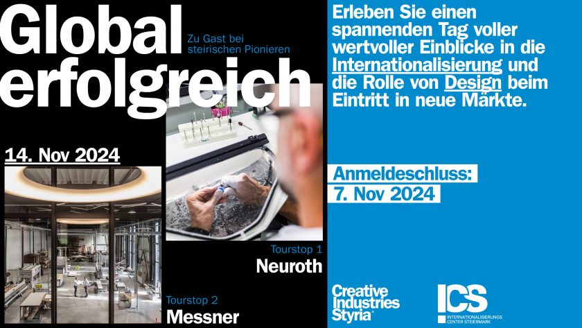 Erleben Sie einen spannenden Tag voller wertvoller Einblicke in die Internationalisierung und die Rolle von Design beim Eintritt in neue Märkte. Am 14. November 2024 laden wir gemeinsam mit Creative Industries Styria (CIS) exportorientierte Unternehmen zu exklusiven Firmenbesuchen bei Neuroth und Messner ein. Entdecken Sie, wie diese beiden erfolgreichen steirischen Unternehmen Herausforderungen und Chancen auf internationalen Märkten meistern und durch Design einen entscheidenden Wettbewerbsvorteil erzielen.