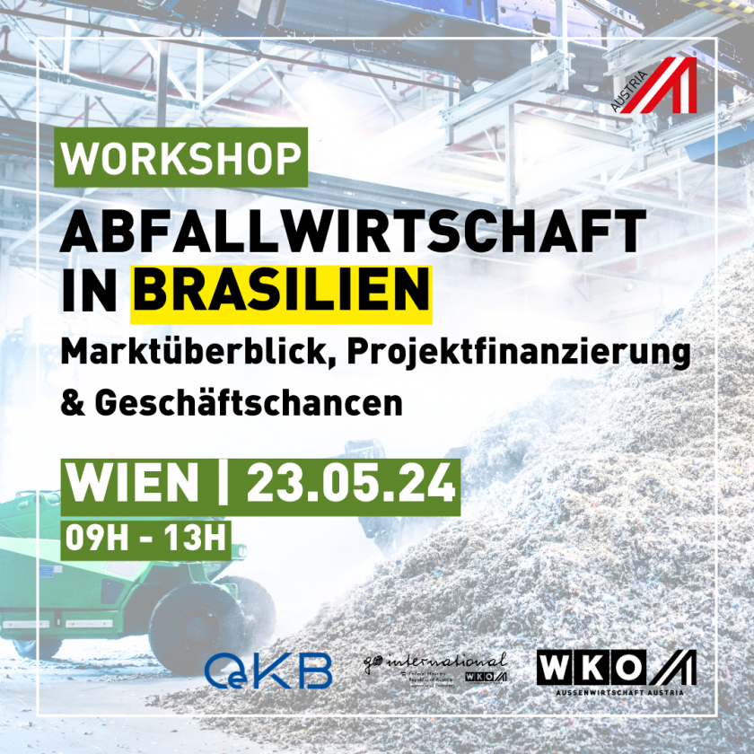 Im Rahmen der Incoming Mission: Waste Management & Energieerzeugung veranstaltet das AußenwirtschaftsCenter São Paulo in Kooperation mit der Oesterreichischen Kontrollbank Aktiengesellschaft (OekB) einen Workshop zum Thema Abfallwirtschaft in Brasilien, welcher am 23. Mai 2024 in Wien stattfindt.